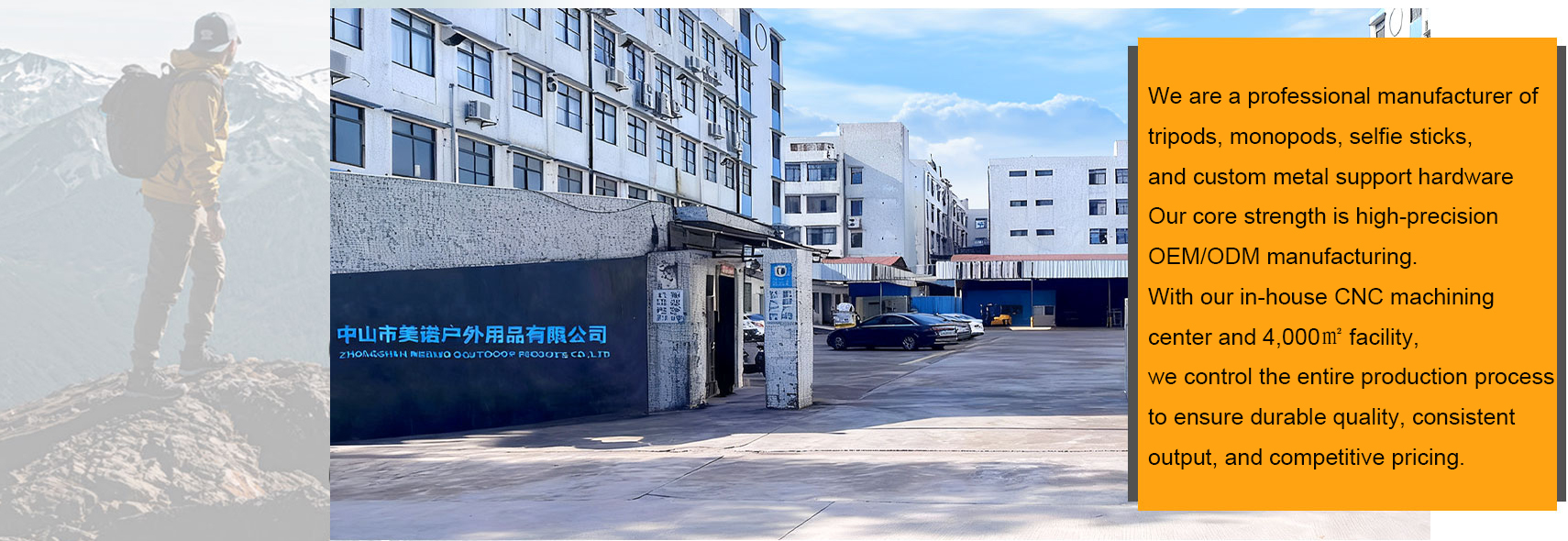 美诺摄影器材有限公司成立于2015年,主要致力于研发生产摄影户外产品,包括摄影三脚架,摄影云台,摄影包,自拍杆等摄影户外产品附件,工厂坐落在广东省中山市坦洲镇,占地面积2000平方米,拥有独立的研发团队和CNC精密数控加工中心。 钰森是美诺户外用品有限公司旗下的三脚架品牌,钰森品牌三脚架自2015年投放摄影市场以来,享有轻...